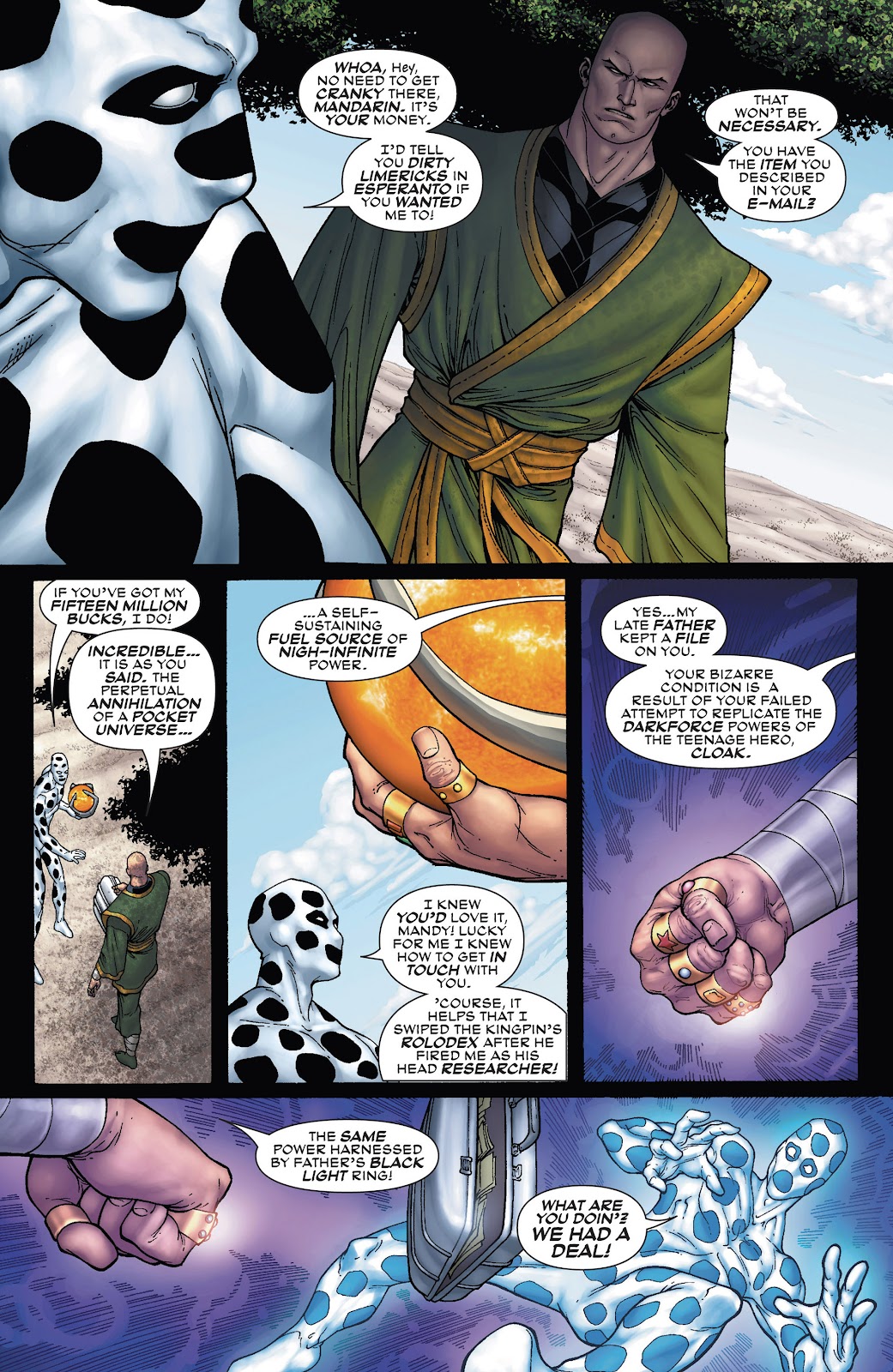 John got his doctorate at the M.I.T., where he was friends & roommates with Quentin Beck (also known as Mysterio). He was a scientist working for the mob boss Kingpin, Dr.Ohn was personally assigned to reproduce the radiation levels of Cloak in order to mimic his powers. In a matter of hours he succeeded, making a singular black portal which he stepped into, this in turn, caused a blackout all across the city. The shock of going into the portal caused John to pass out, when woken up again he found himself in a dimension of infinite portals, after searching he found the original portal he came from and escaped. When John left his body was covered head to toe in spots (he would later learn to turn this off and on at will), realizing those spots were spatial portals he decided to test it against Spider-Man.