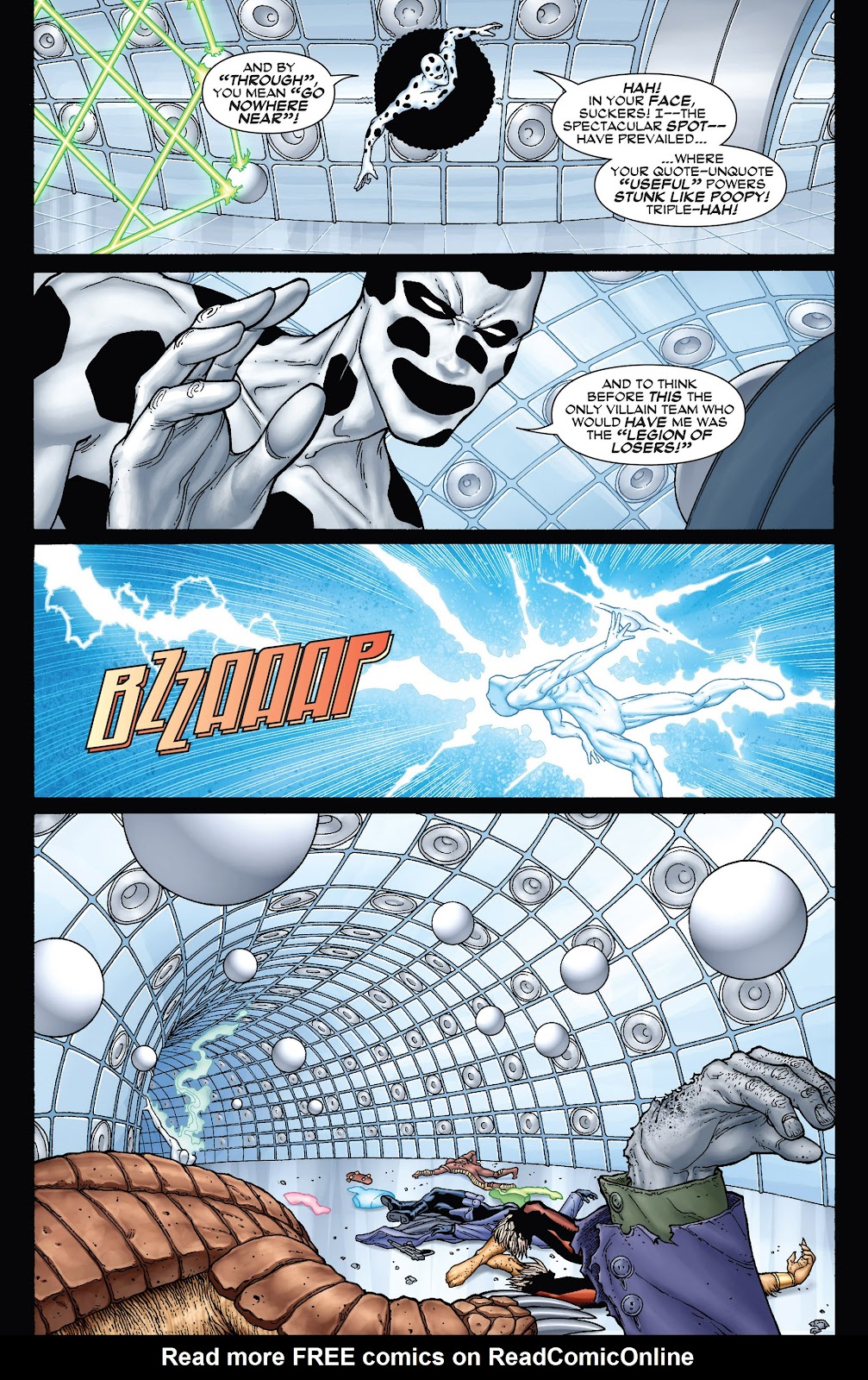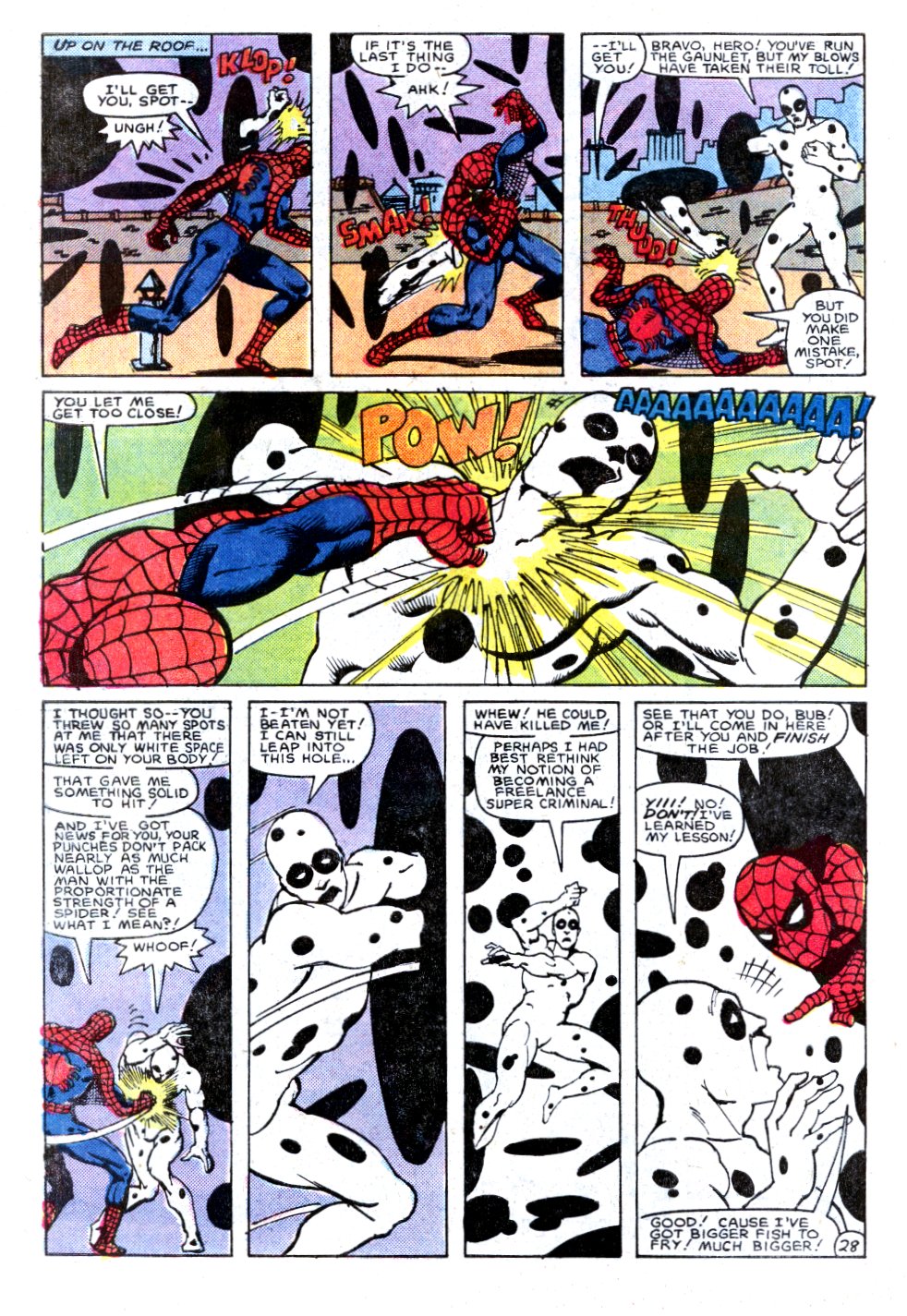 So he went to find and fight Spider-Man, when he found Spidey he announced his name as The Spot. Unsurprisingly, Spider-Man laughed at him, mocking his name. After a quick scuffle, Spot was actually winning against Spidey; before he left he told both Spider-Man & Black Cat to stop harassing the Kingpin or he'll be forced to destroy them. Later when Spider-Man & Black Cat were on their way to attack the Kingpin Spot & Spidey had another run-in, this time however Spidey won by having Spot make so many portals there would be only white space left on his body. Later he formed a team with Gibbon, Grizzly, and Kangaroo called; Spider-Man revenge squad (or Legion Of Losers), this team unfortunately was short-lived as they soon disbanded due to arguments & fights breaking out within the team. Spot once helped Tombstone escape from a high security prison which in return for helping him, Tombstone snapped his neck. Fortunately Spot was later shown to have survived.