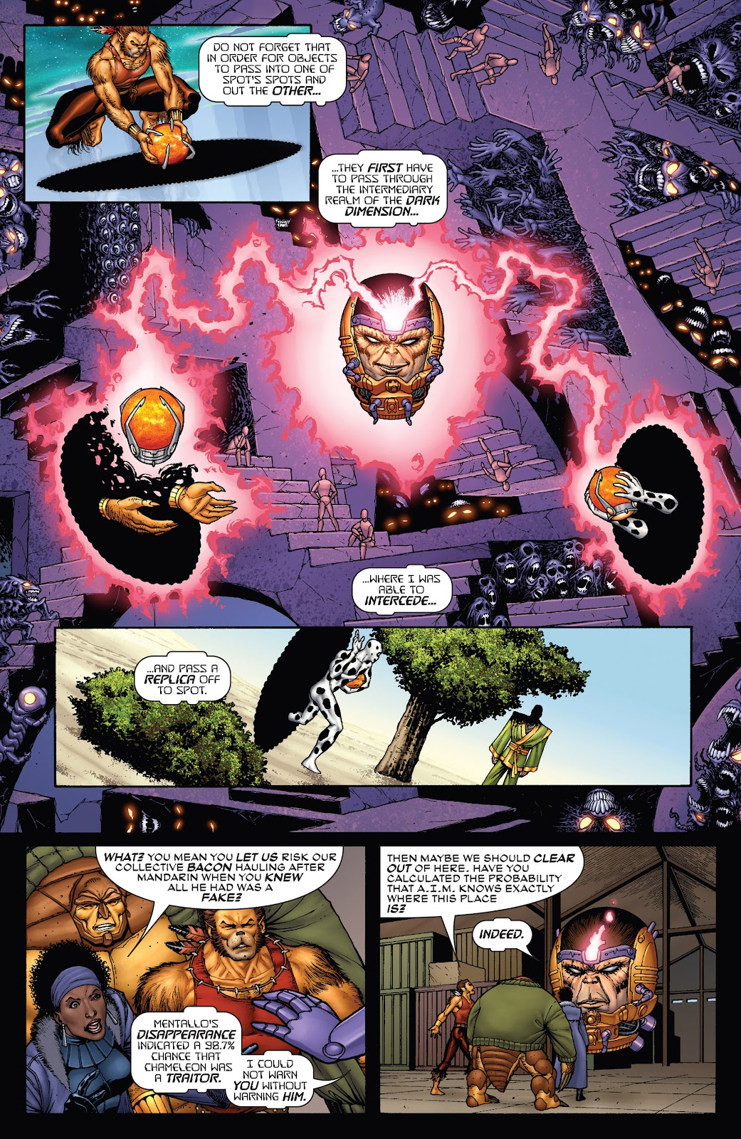 This dimension is the main way Spot uses his powers. This dimension is half light and dark; while inside you're almost weightless. The spots let John defy all laws of physics by being able to disconnect parts of his body in mid-air or on any surface; gravity having no effect on it whatsoever. John first has to get through the Intermediary realm of the Dark Dimension to get to his destination. John can control the sizes of the portals to make him portable or to make them as huge as possible, usually he uses the portals to have his opponent hurt themselves, or spam portals that he can go into and overwhelm his adversary. Later on in his career he was able to make extra limbs for himself and disconnect body parts like the head after experiments from the Coyote.